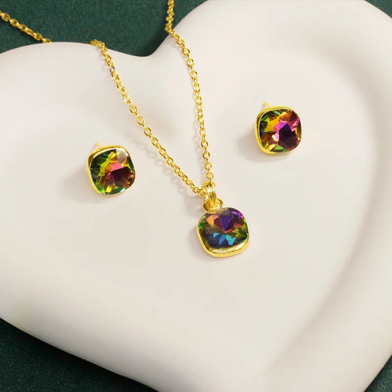 Este conjunto de cadena, dije y aros bijouterie te ofrece un delicado brillo con detalles en tonos rosa y verde con efecto similar al brillo del cristal, perfecto para lucir elegante en cualquier ocasión, especialmente en fiestas. Hecho con material bijouterie dorado, es una elección ideal para complementar tu atuendo.