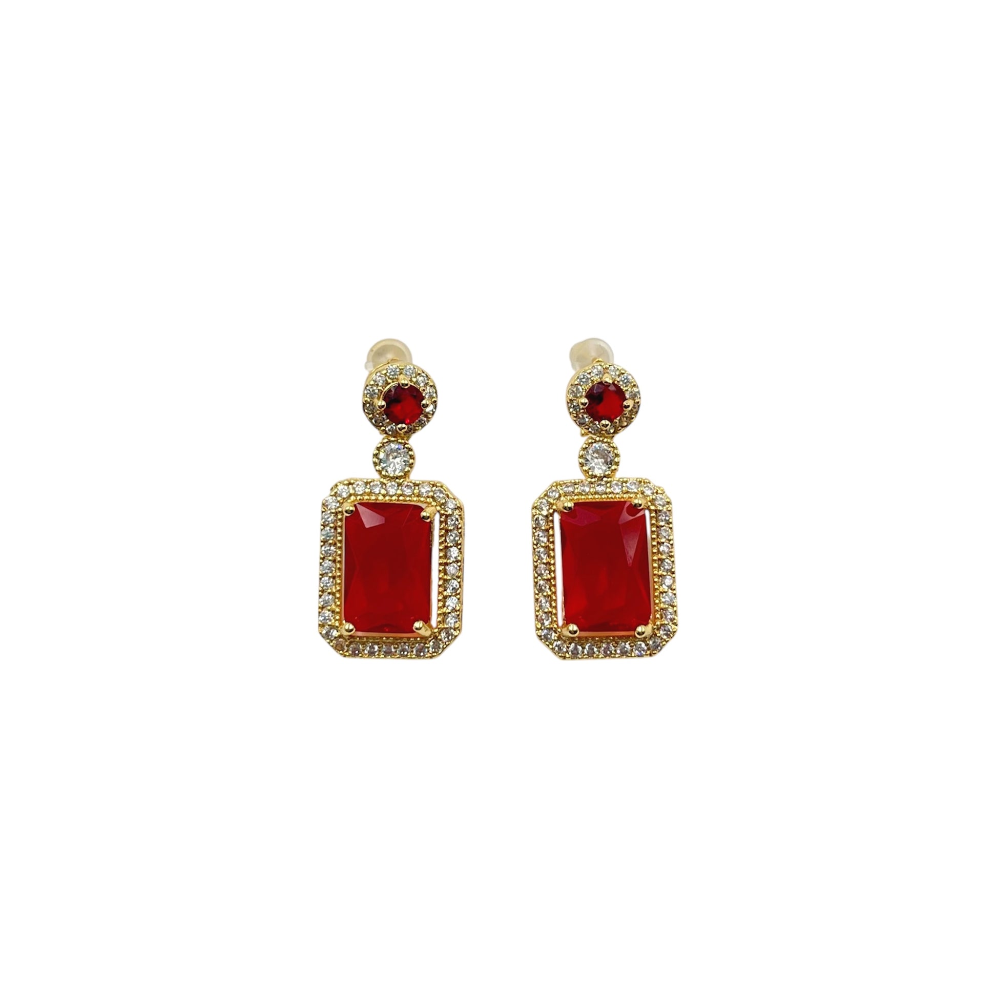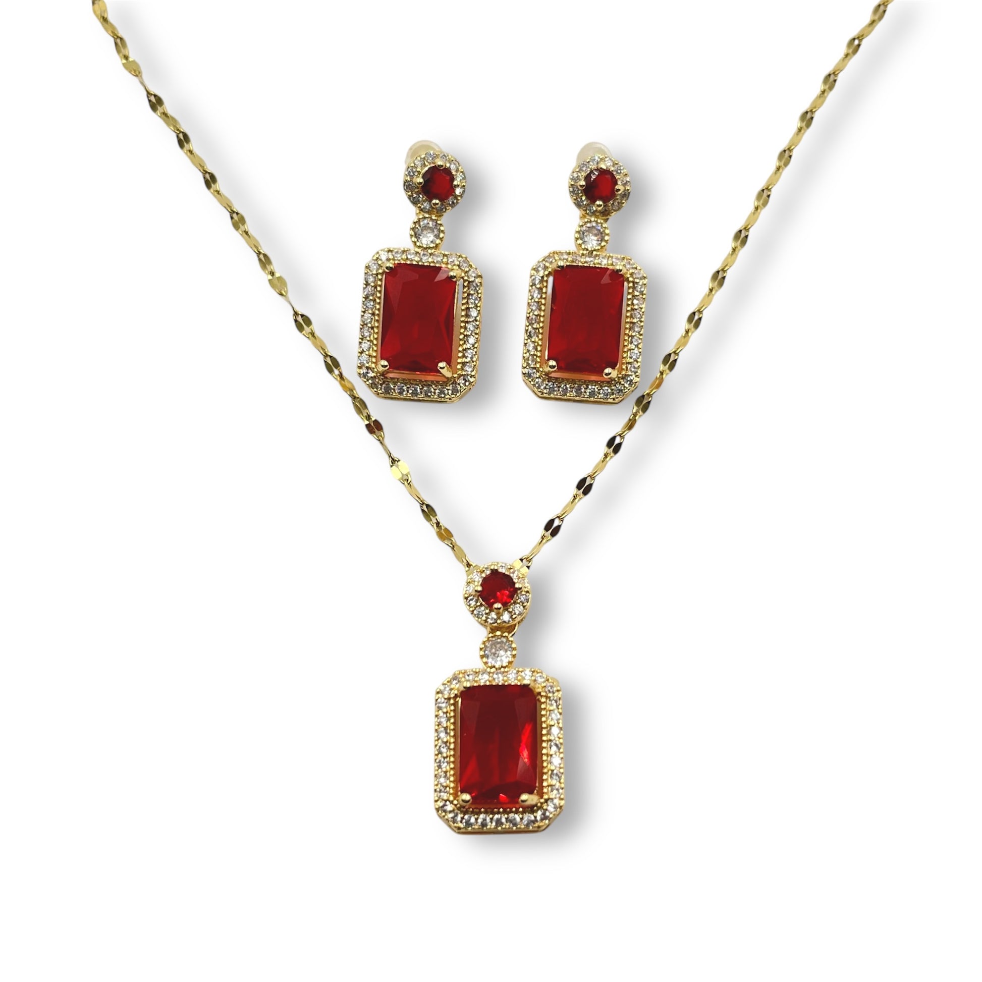 Este conjunto en acero dorado presenta una cadena y un dije con aros cuidadosamente diseñados para ofrecer resistencia y estilo. La piedra rectangular roja, complementada con pequeños strass blancos, aporta una elegancia discreta que realza cualquier atuendo.