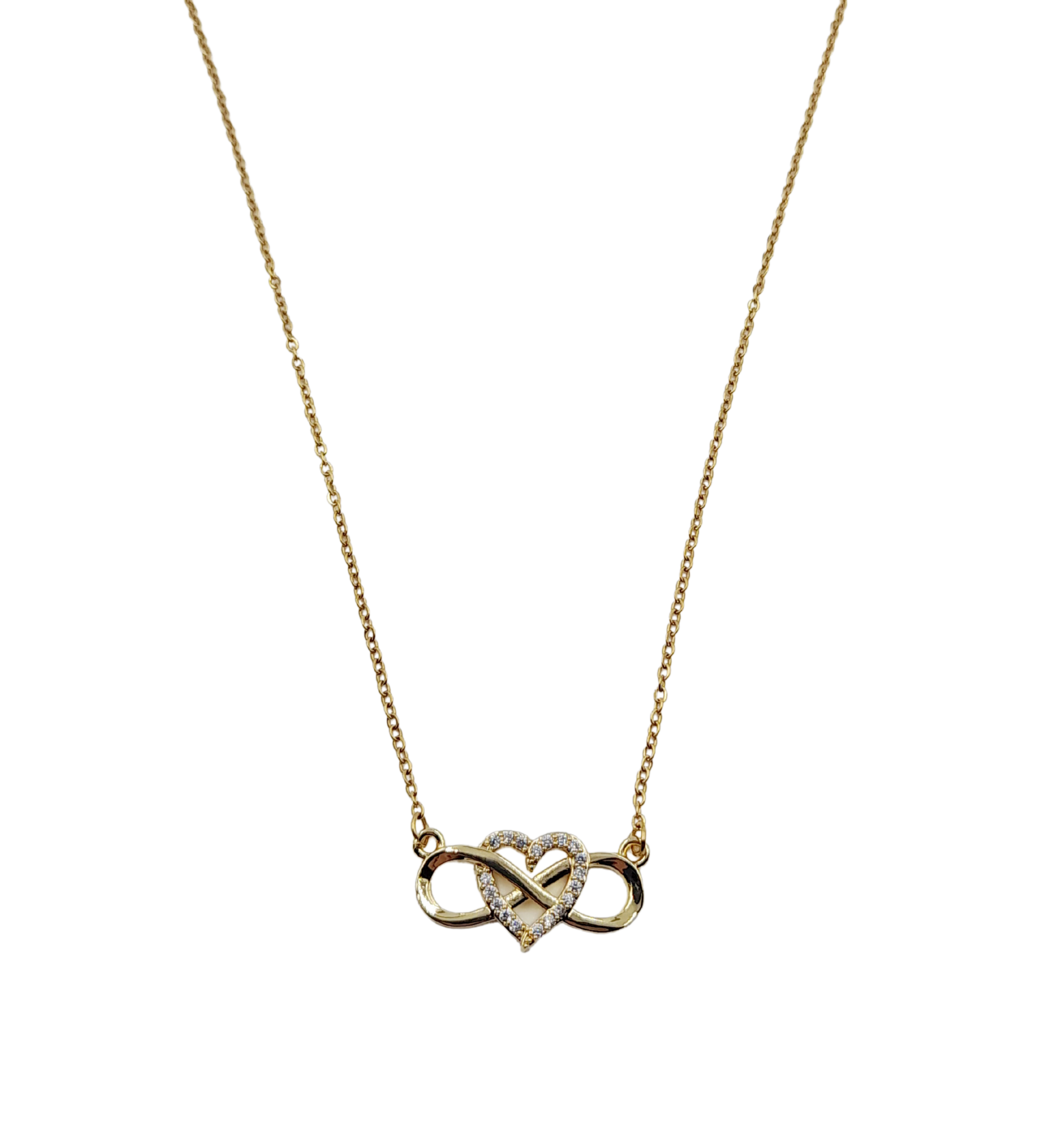 Este conjunto en acero dorado incluye una cadena delicada acompañada de un dije que combina los símbolos de corazón e infinito, representando amor eterno y conexión sin límites. Ideal para quienes buscan una pieza elegante y significativa que complemente cualquier estilo, este accesorio aporta un toque sofisticado y personal a su colección de joyas.
