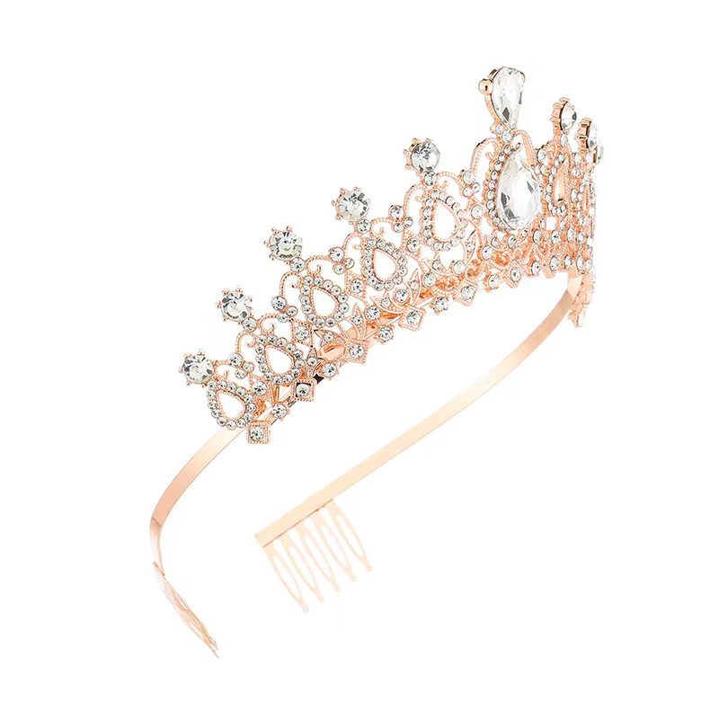 Este elegante accesorio de moda, con su corona de color dorado rose y hermosos detalles de strass blanco, es perfecto para cualquier ocasión especial. El brillo y la sofisticación que aporta a tu atuendo son inigualables.
