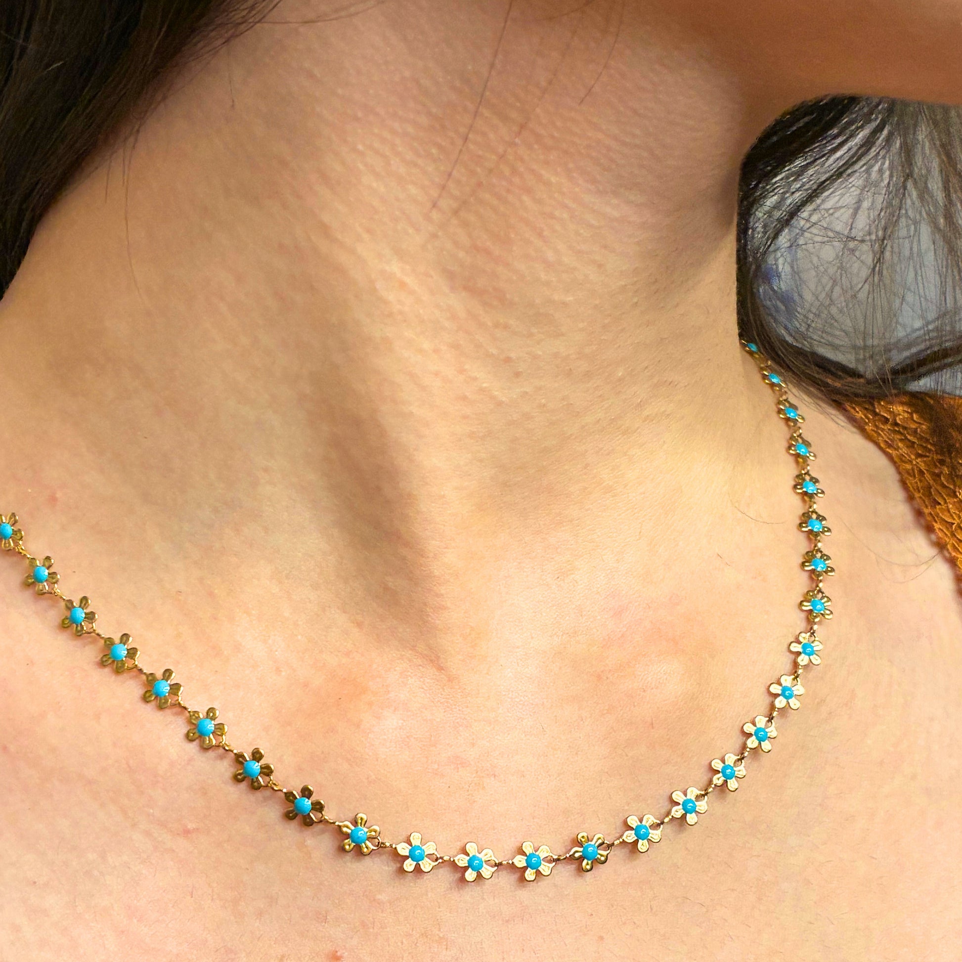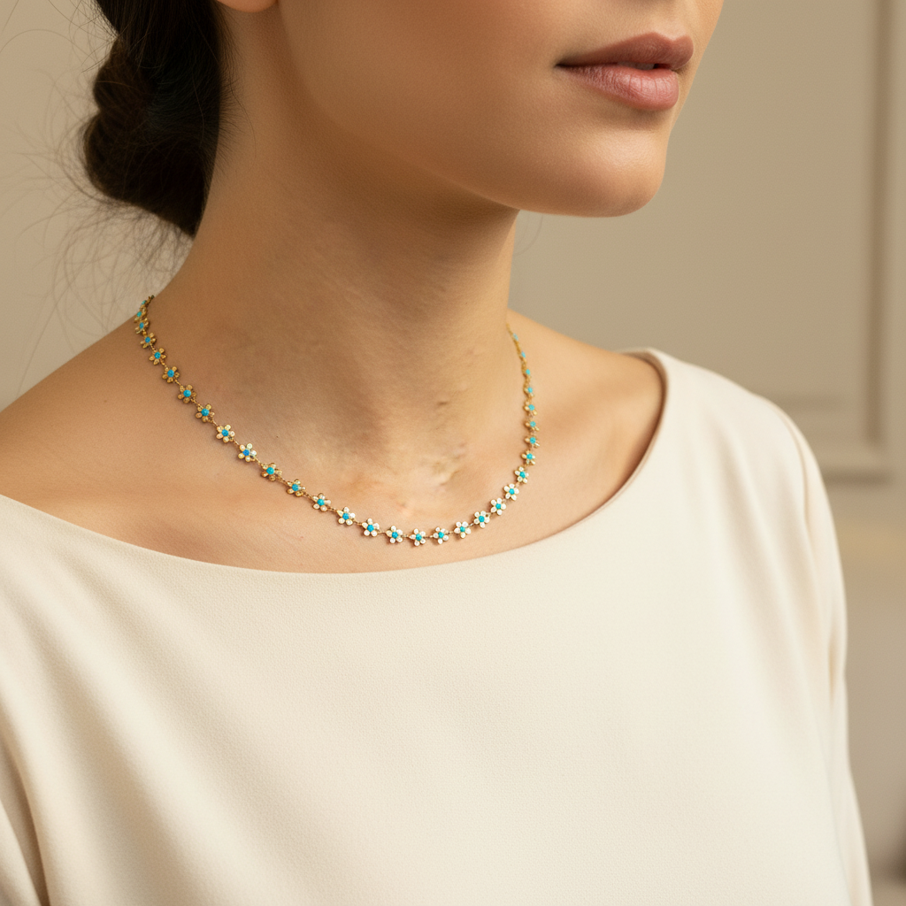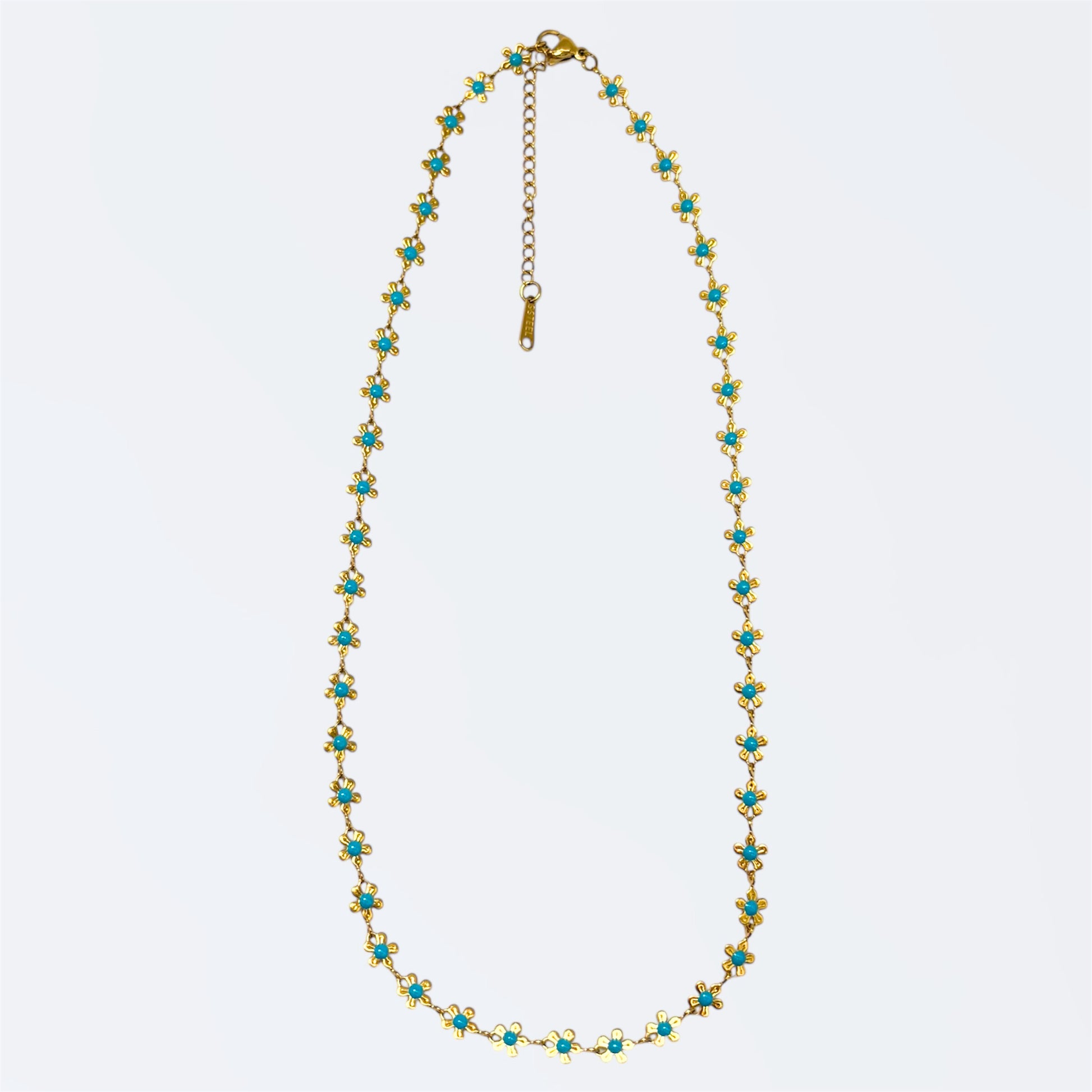 Delicada y luminosa, esta gargantilla en acero dorado destaca por sus encantadores detalles en color turquesa, que aportan frescura y un toque veraniego a cualquier look. Su diseño fino y femenino la convierte en el complemento perfecto para usar sola o combinada con otros collares.