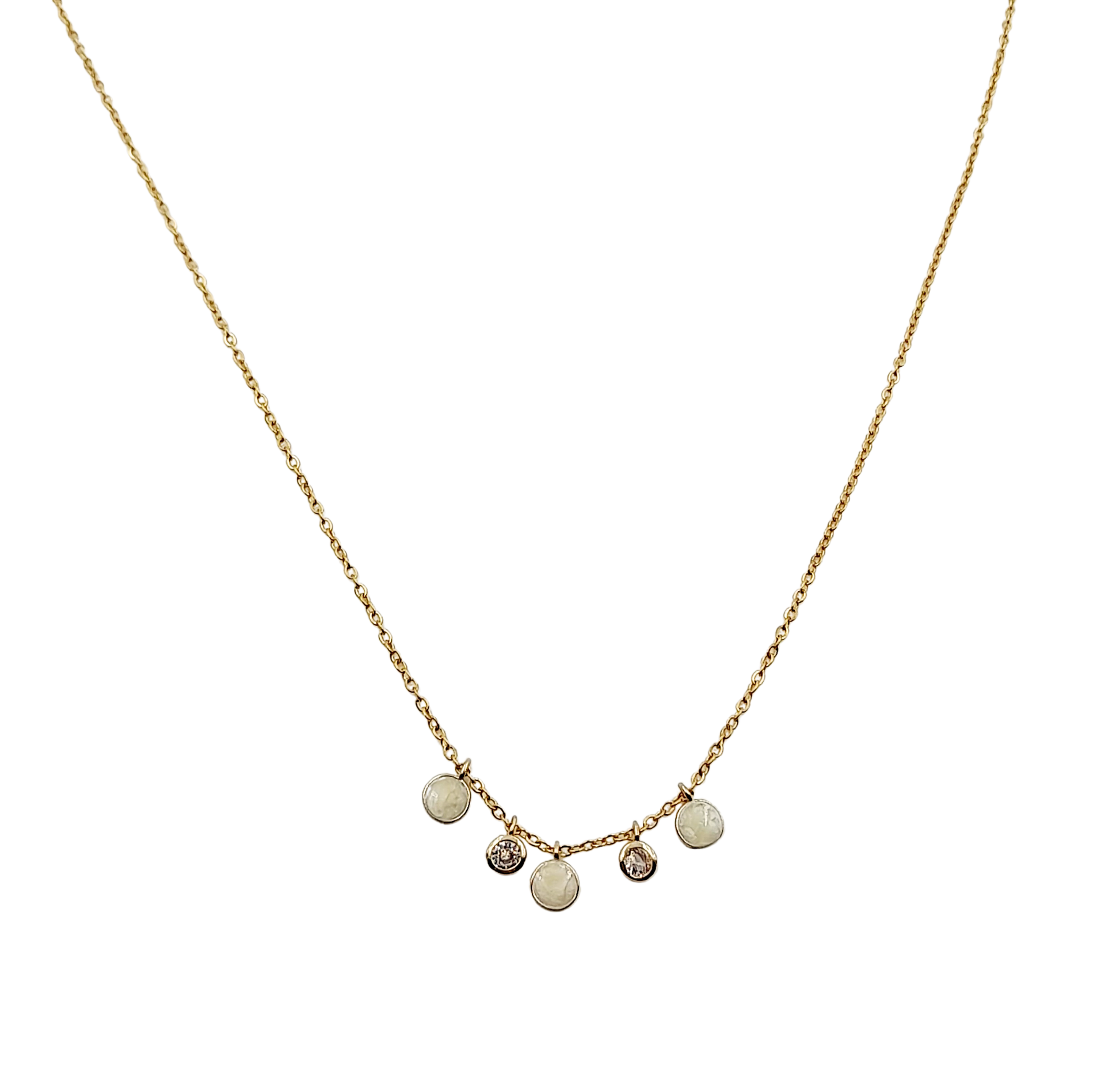 Esta gargantilla en acero dorado destaca por sus delicados dijes minis esmaltados en blanco, intercalados con detalles de strass que aportan un brillo sutil. Su diseño elegante la convierte en una opción ideal para regalar en quince años o para adolescentes.Perfecta para complementar cualquier look con un toque de distinción.