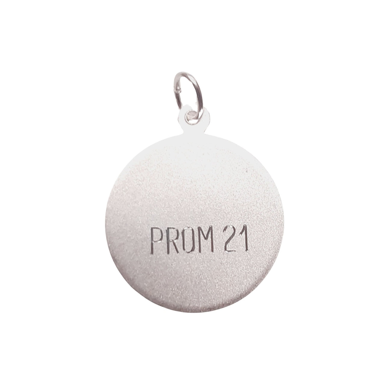 Medalla de alpaca enchapado en plata de 22mm diseñada especialmente para reconocer a los egresados, con posibilidad de grabar dos letras en el frente y la frase "Prom 25" en la parte trasera. Fabricada con alpaca de primera calidad, ofrece durabilidad y un estilo sofisticado.