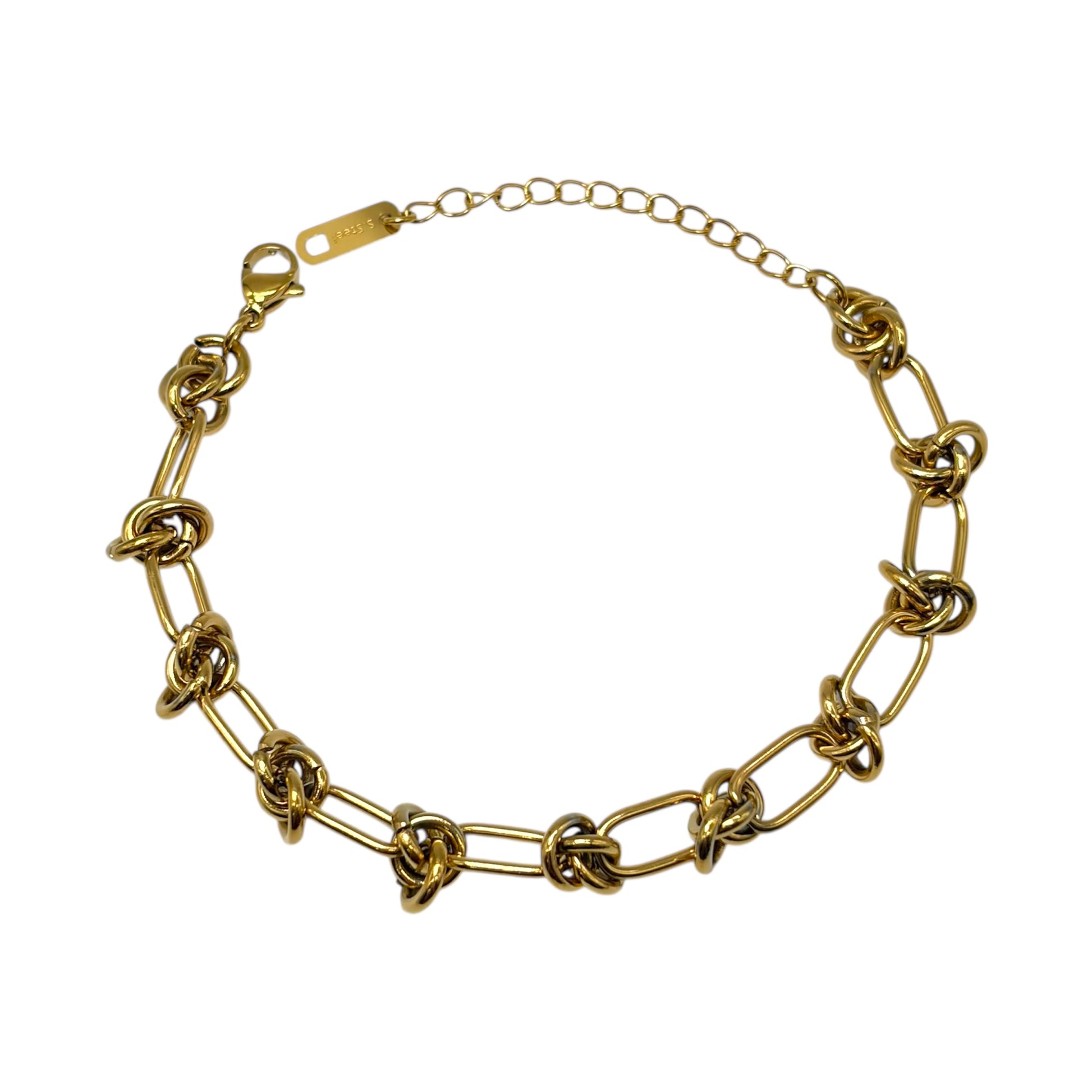 Pulsera de acero dorado con eslabones rectangulares y detalles de nudos. Diseño moderno, resistente y cómodo, con cierre mosquetón y cadena de extensión regulable.