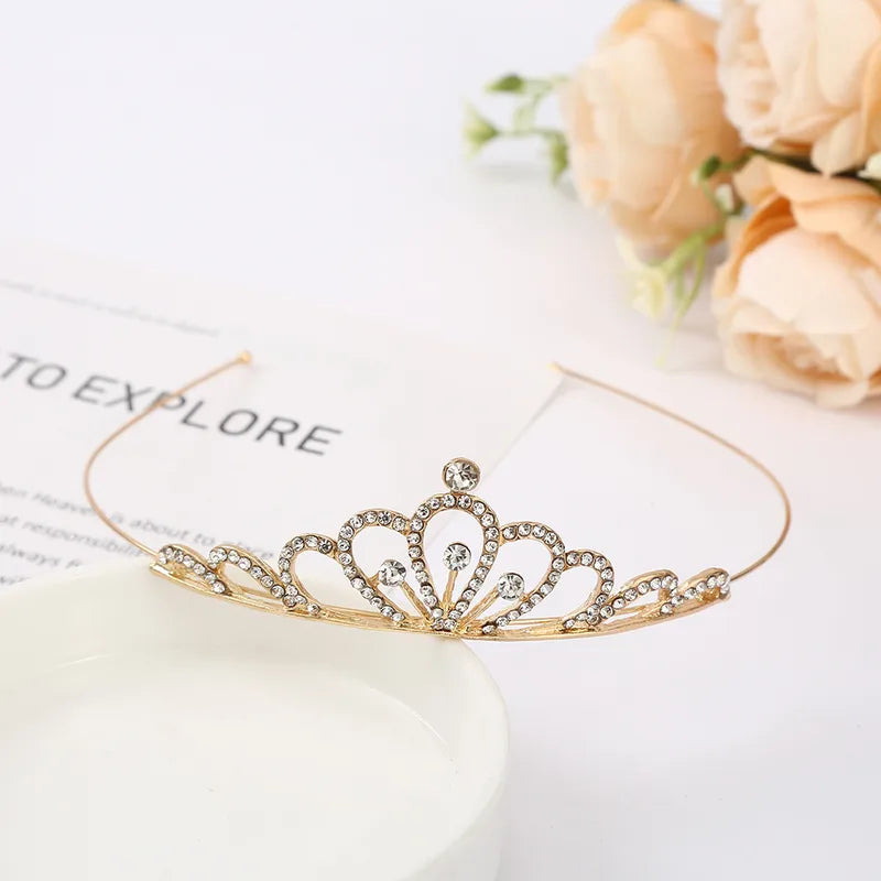 Esta tiara dorada es perfecta para quinceañeras que buscan un toque sofisticado y elegante en su atuendo. Con un diseño simple, pero adornado con strass blanco, esta tiara es la combinación perfecta de estilo y sutileza. ¡Haz que tu día especial sea aún más brillante con esta hermosa tiara dorada!